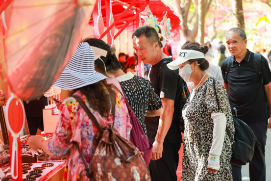 市集围绕“归·福泽”主题,精心规划了非遗文化、文创产品、美食小吃三大功能区。熙熙攘攘的人群中,既有举家出游的本地市民,也有慕名而来的外地游客,大家或驻足观赏非遗技艺,或品尝地道琼味,欢声笑语此起彼伏。